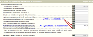 2- Anem a les caselles 542 o 543 i hi posem el valor que volem objectar (l'escull cada persona que faci la declaració). Imprimim el document. Un cop imprès, ratllem l'explicació i anotem «Per a objecció fiscal a les despeses militars».