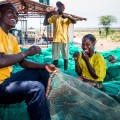 dijous, 07 de de febrer de 2019 Tenen dues gàbies i dos cops a l'any pesquen els seus peixos. Van començar estalviant diners (ZMK 5 per setmana per persona). El grup es conforma per un total de nou dones. Van començar a pescar al 2014, però l'inici va ser difícil. L'organització Yalelo va decidir ajudar-los brindant-los alevins, suport tècnic i venent-los pinso per als peixos. El benefici del peix s'inverteix a la botiga que posseeixen juntes.