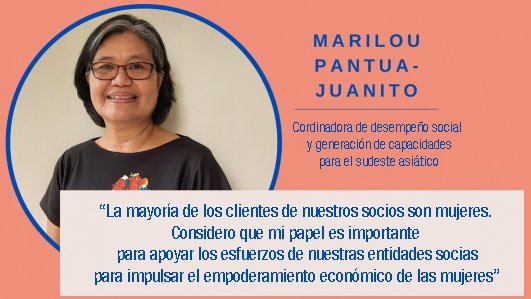 Oikocrediten lan egiten duen beste emakume ospetsu bat Marilou Pantua-Juanito da. Ia zazpi urtez izan da Gaitasunen Garapeneko eta Gizarte Jarduneko koordinatzailea Asiako hego-ekialdean. Marilouk Oikocrediten proiektu batean parte hartu zuen: Genero-arrakala murriztea finantza-inklusioaren bidez. Proiektuan parte hartu zuten bezeroek inspiratu zuten. Genero-rolak negoziatzen ikasi zuten, lan egiteko denbora gehiago izateko.